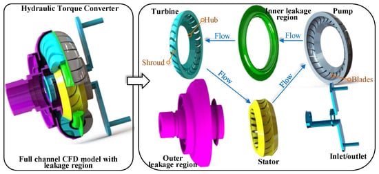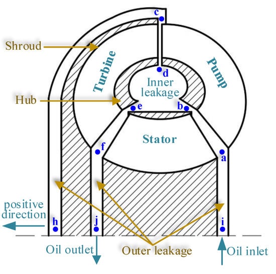 Hydraulic torque converter is a fluid-driven machine that uses oil circulation to transfer energy. It offers functions such as stepless speed regulation, adaptive loading, and engine vibration absorption, significantly enhancing a vehicle’s power, reliability, and off-road capabilities. As a result, it has become a core component of transmission systems [1] and is widely employed in tank armored vehicles, passenger cars, off-road vehicles, construction machinery, ships, and other equipment. The hydraulic torque converter primarily consists of three impellers: pump, turbine, and stator. The pump impeller is connected to the engine, transferring energy to the working oil to drive the turbine impeller, which, in turn, powers the load. The working fluid circulates back to the pump impeller through the stator, forming a flow field circulation. Figure 1 shows a schematic diagram of its structure, where points a, c, and f denote the outer inlet points of the pump, turbine, and stator, respectively. Points b, d, and e represent the inner inlet points of the pump, turbine, and stator, respectively. The ch segment represents the flow passage formed on the left side by the components connected to the pump and turbine. The ai, fj, and ch segments collectively constitute the outer leakage area, while the bde segment constitutes the inner leakage area.