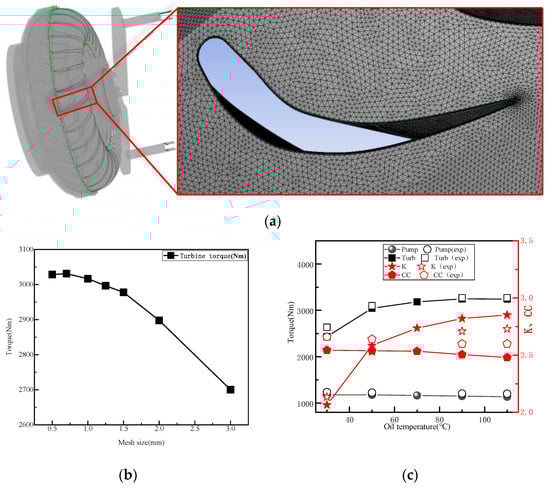 Torques for the pump (TP), turbine (TT), and stator (TS) are extracted from the numerical results. A comparison of the torque ratio (K) and energy capacity coefficient (CC) tests and simulations is conducted for different impeller speeds during the starting condition, as shown in Figure 3b, in order to verify the model’s accuracy. The results indicate that the simulation error for the hydraulic torque converter’s performance parameters in the CFD results is within 10%, demonstrating the model’s credibility.