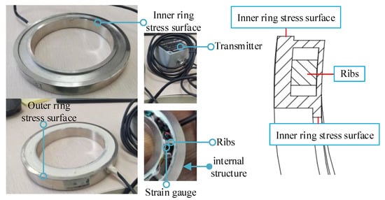 The structure and operating principle of axial force sensors are shown in Figure 4. The axial force sensor features a ring structure, facilitating easy installation on the shaft. Inside the sensor, multiple ribs with attached strain gauges connect the inner and outer rings. Both the inner and outer rings have a convex circular ring to bear the axial force, resulting in the deformation of the ribs. The full bridge circuit, comprised of strain gauges, converts force data into strain output voltage signals, ultimately yielding accurate axial force data, as illustrated in Figure 4. The axial force sensor has an input voltage range of 0–12 V, an output range of 0–5 V, a measurement range of 0–30,000 N, and an error of 0.1% FS.