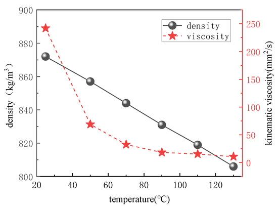 Figure 7 shows the viscosity and density change curves of 15W-40 oil at different temperatures as measured in the experiment. It can be observed that as the working temperature increases, the viscosity and density of the oil gradually decrease, with the viscosity decreasing more rapidly at lower temperatures [30]. The impeller axial force changes under starting conditions when the pump speed is 1800 rev/min, as shown in Figure 8. In this study, the positive direction of axial force is defined as the direction from the pump to the turbine, while the opposite direction is considered negative (Figure 1).