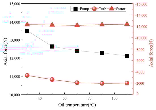 The results show that the pump axial force is positive, while the turbine and stator axial forces are negative. The pump axial force is most affected by temperature, followed by the turbine, while the stator axial force is barely affected by temperature. In addition, the axial forces of the pump and turbine both decrease as the temperature increases, with a more rapid decline at lower temperatures and a tendency to stabilize at higher temperatures.