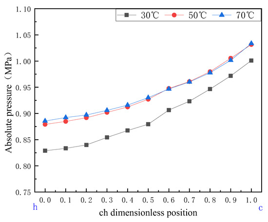 Taking the ch section as an example, the pressure change trends at different temperatures for the non-dimensional position are shown in Figure 9. The pressure change trends are similar at different temperatures, with the overall pressure increasing as the temperature rises and approaching stability above 50 °C. Figure 3c indicates that as the temperature increases, the torque ratio also increases, enhancing the “stirring capability” of the pump. Therefore, temperature changes do not affect the simple circumferential flow pattern within the ch section but rather affect the pressure at point c at the pump outlet, thereby influencing the pressure distribution in the leakage area.