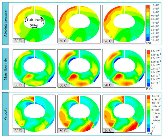 Figure 10 illustrates the distribution of absolute pressure, mass flow rate, and flow velocity in the axial flow plane within the torque converter. It can be observed that at low temperatures, the pressure gradient is relatively small, with high pressure occurring at the impeller outlet and turbine inlet. As the temperature increases, the high-pressure region begins to appear on the outer ring of the turbine, while the low-pressure region emerges in the guide vane area. Additionally, the pressure distribution gradient increases with rising temperature. Furthermore, the mass flow rate of the oil increases as the temperature rises, with substantial changes at low temperatures. When the temperature exceeds 60 °C, the mass flow rate distribution stabilizes, with its peak value appearing at the inlet of the guide vane and turbine.
