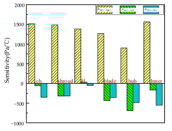 Figure 11 illustrates the pressure sensitivity of various parts of the pump. The average pressure rises most sharply at the working temperature of 30 °C to 50 °C, and the axial forces of each part also increase rapidly. Among them, the pressure sensitivity in the inner is the smallest, while the pressure sensitivity in the inner leakage area is the largest. This means that the leftward axial force generated by the pump’s inner has the smallest increase, while the rightward axial force generated by the inner leakage has the largest increase. Therefore, this is reflected in the total impeller axial force as a decrease in the impeller axial force value and a trend to reverse direction (rightward). After 50 °C, the pressure in each part tends to stabilize, and the pressure sensitivity is generally at a relatively low level. Among them, the pressure sensitivity in the ai section is the largest. Compared to other parts, the pressure decreases slightly, and the axial force generated by the ai section changes the least. Thus, this is reflected in the total impeller axial force as a slow decrease in the impeller axial force value and gradual stabilization.
