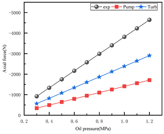In the static state of the torque converter, experiments were carried out to measure the axial forces of each impeller under different charging oil pressures. The results are shown in Figure 12. It can be observed that the axial force measured by the turbine is directly proportional to the supply oil pressure, while the axial force experimental data measured by the sensor on the pump side is 0. This is because at this time, the axial force directions of both the pump and turbine are negative and act together on the bearing on the turbine side. Therefore, when the pump axial force is in the negative direction, the axial force experimental values collected by the sensor at the turbine in the experiment are the sum of the axial force values of the two impellers.