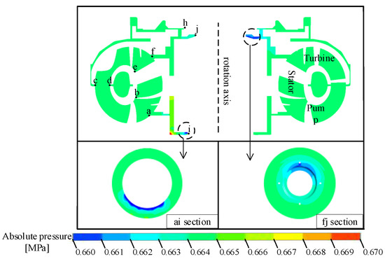 As shown in Figure 13, in the static state, the torque converter is filled with oil, and the pressure in all areas is essentially consistent. At this time, the stator has equal axial force-bearing areas on both sides, and its axial force is nearly zero. The turbine is also fully immersed in oil, but the size of the turbine axial force is directly proportional to the supply oil pressure. This is caused by the uneven pressure distribution in the fj section, as shown in the figure. The fj section is directly connected to the outlet flow channel, resulting in the pressure attenuation shown in the figure. Therefore, there is an initial axial force to the right in the turbine. Although the axial force-bearing areas on both sides of the pump are the same, the ai section is connected to the inlet flow channel, and there is a similar pressure attenuation in the ai section, resulting in an initial axial force to the right in the pump.