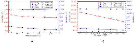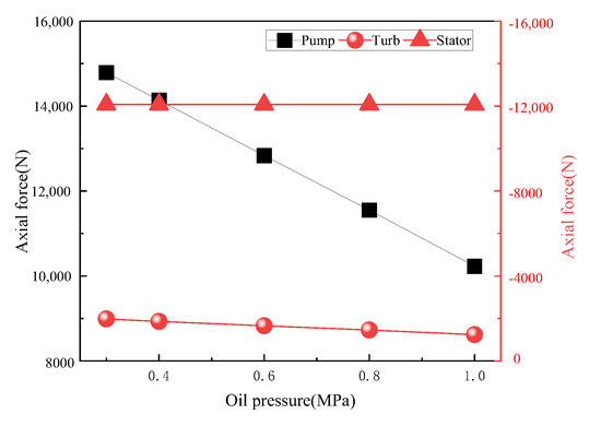 Under the starting condition with the pump speed of 1800 rev/min, the axial force of the impeller changes with the pressure of the charging oil, as shown in Figure 14. For every increase of 0.1 MPa in supply oil pressure, the axial force of the turbine decreases by approximately 100 N, the pump decreases by approximately 600 N, and the stator remains unchanged.