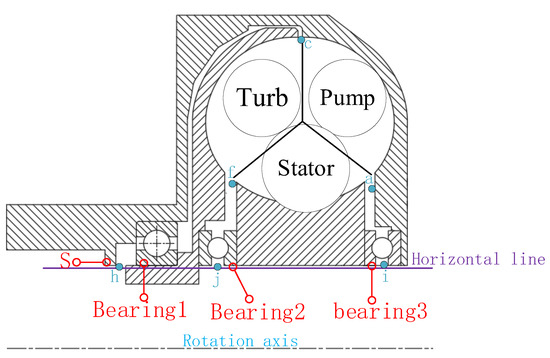 Different flow passages exert different directions of axial force on the impeller, and their total axial force receiving area is defined as the axial imbalance area. According to the schematic diagram of this model structure shown in Figure 16, point i and point h of the pump are on the same horizontal line, but there is a wall surface S at point h that generates rightward axial force. The overall axial force of the pump is directed to the left, and bearing 1 is in an interference fit with the pump, with the force acting on bearing 1 applied to the pump.