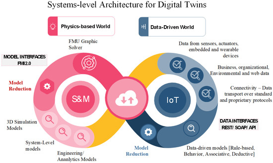 In [10], the authors propose the technologies enabling DT development, which is the combination of the digital world such as simulation and modeling (S&M) and the physical world such as the IoT. The S&M approach for DTs creates the possibility of modularizing the development of DTs and focusing on the essentials. However, it also introduces large amount of complexity in building and operating such DTs. These models can arise from different domains of the physical object. They are complex, real-time, “living” entities. These models can be organizational information models, engineering models (thermal, fluid, dynamic, electrical or systems-level), rule-based models (associative, deductive or degradation) or purely data-driven models (ANN or deep-learning-based models). The Internet of Things (IoT) or Industrial Internet of Things (IIoT) facilitate building real-time models based on the data. Figure 1 demonstrates the system-level architecture that combines the IoT/IIoT and S&M to provide the foundation for such DT development. A similar approach was also adopted in [11] for a DT development.