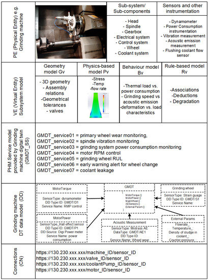 To realize the complexity of the DT development process, a reference model is crucial. The five-dimensional representation of the DT provides such a reference model [21,22]. In this section, the five-dimensional representation from the literature is utilized to build a reference model for DTs. Figure 2 presents the reference model based on a grinding machine case study [9].