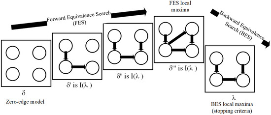 It was proved that, for two DAGs δ and λ, where δ is an I-map of λ, there are a finite sequence of edge additions and reversals in λ, such that: (1) after each edge modification, δ remains I-Map of λ, and (2) after all modification, λ is a perfect map of δ. The two-phase algorithm starts with a graph assuming that there are no dependencies. This is indicated as the zero-edge model. Then, all possible single edges are added till the algorithm reaches a local maximum. The phase of progressively adding single edges in the DAG is known as the forward equivalence search (FES); the corresponding local maxima is known as the FES local maxima. Once the FES algorithm stops at a local maximum, a second-phase greedy algorithm is applied that considers at each step all possible single-edge deletions that can be made to the DAG. This phase is known as the backward equivalence search (BES). The algorithm terminates when the BES local maxima is identified. The concept is demonstrated in Figure 3.