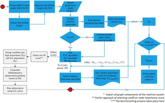 The evolution of the GBMR method continued when more fundamental questions were raised about the causal graph structure. The hybrid graph input to the GBMR method assumes that the causal graph structure is complete when the node-importance measuring algorithms are run on it. This is indicated by a * sign in Figure 4 when importing the graph from the graph library. That means that the graph structure does not change at runtime (no nodes or edges are added or removed). Hence, it becomes possible to segment the bigger graph into structurally similar chunks. A spectral clustering-based graph-cut method for DAGs was used for this purpose [41]. The spectral clustering method learns the graph structure and provides the hierarchical clusters based on the graph Laplacian [42]. The spectral clustering algorithm classifies the parameters into cluster membership based on the adjacency matrix. The spectral clustering algorithm computes the normalized graph Laplacian such that: