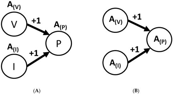 The GBMR process starts with building the initial graph. However, this initial graph is a physics-based representation. The DT is a hybrid representation. There is a need to inject process data into the initial graph generated in the previous step to build such a hybrid graph. Hence, process parameter data is collected with IoT platforms. When the parameter graph and data are available, an analogy modeling technique is followed to generate the relationship between the parameters. For example, the relationship between the power consumption (P), voltage (V) and current (I) of a machine could be established based on the popular relationship with the initial graph, as shown in Figure 5A. If the data obtained from the machine contains datasets such as active power (A(P)), active voltage (A(V)) and active current (A(I)), the datapoints could be appended to the initial graph and a hybrid graph could be established, as shown in 5b.