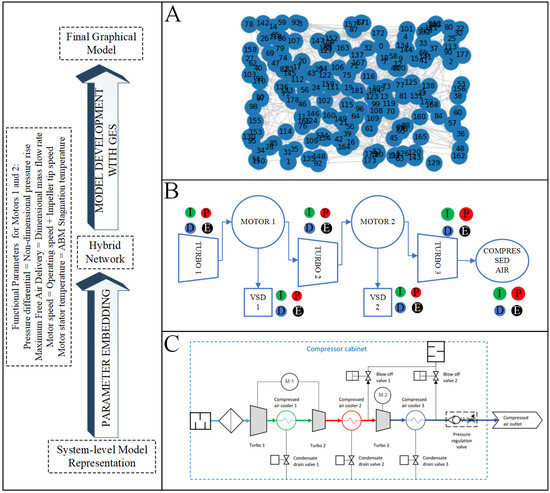 The initial graph captures the physics-based representation of the system; however, it is bound to the steady state of the system and its implication is theoretical. In earlier studies, efforts were made to define the practical usage of this causal graph entity using theories from artificial intelligence. In this article, the utility of the physics-based initial graph is set to guide the development of a graph-based representation of the system-level model. System-level models, such as those in the Figure 7C, represent the dynamic state of the system that is related to the physical phenomena guiding it. In the VSD unit of turbo fans and motor systems shown in Figure 5B, the variables from the dynamic system model could be organized and the causality between these variables can be extracted guided by the initial graph (i.e., the Greitzer compression system model). Therefore, embedding the parameters or the network from Figure 4 into the relevant sections of Figure 7C, a hybrid of the physics-based and the systems-level models is created. This combination of the physics-based and systems-level models is known as the hybrid graph. The resulting hybrid graph is the dynamic system-level model in DAG form.