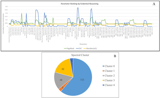 The WPR and EVC scores are shown in Figure 8A. The WPR scores of nodes in cluster0 are consistent. The intersection of the high WPR scores with cluster0 are agreeable, except the environmental parameters that were added to the dataset externally. The highest WPR score was given to maximum FAD. This is consistent with the hybrid graph, as FAD was considered as a target variable. The WPR also nominated motor speed as important, which was associated with FAD in the hybrid graph. EVC agrees with the WPR in many cases; however, EVC differs in the ranking scheme given by WPR. State variables such as the motor state and turbo state differ considerably between EVC and WPR. Hence, the consolidated ranking results are obtained from the node importance algorithms with DST. This is indicated by the difference between the blue and green lines in Figure 8A. DST was applied to this hierarchical ranking system to find a combined ranking. This is indicated by the yellow line and marked as the final evidential mass or . DST is able to consider all the available pieces of evidence in deciding whether a node is important or not and can give a trusted final decision. After application of DST, the nodes were rearranged, and the nodes lying in the intersection of cluster0, cluster2 and cluster3 with were considered as important nodes. These nodes were stored in a high importance parameter matrix [XH] and the other variables were kept in a low importance parameter matrix [XL]. The GBMR process is documented in [46].