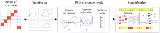 Figure 3 illustrates the entire modeling process of the SPCE model. Initially, the training set is generated using the uniform design method to ensure the representativeness of the samples. Next, a polynomial matrix is constructed based on Hermite and Legendre polynomials, and the coefficient vectors are calculated to develop the PCE surrogate model. Finally, a sparsification method is introduced to reduce the number of coefficients while retaining the accuracy of the model, which is verified with the R2 and RMSE of the testing set. In contrast with the training set, the sample points of the testing set are selected randomly.