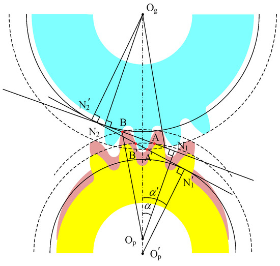 where α′ is the working pressure angle, and α and a0 are the initial working pressure angle and initial center distance. Due to the change in the working pressure angle, the transverse contact ratio also changes, which can be expressed as:
