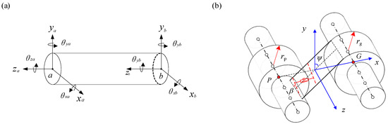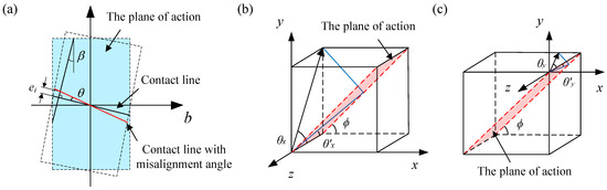 where ei is the mesh clearance, bi is the coordinates along the tooth width, θ is the misalignment angle on the plane of action, and β is the helix angle. According to the projection of the space angle, θ can be calculated from the angular displacement θx and θy (see Figure 5b,c):