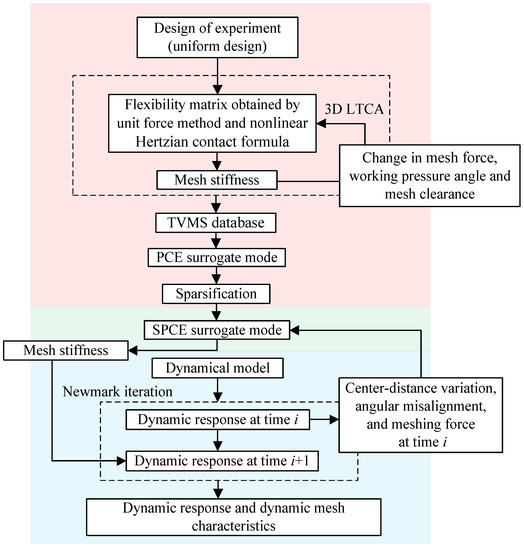 As mentioned above, most studies use the quasi-static method to calculate TVMS, and only the deformation of a gear pair is considered, and the influences of system deformation and gear vibration are often ignored. Although the contact algorithm based on FEM takes these factors into account, it has the problems of low efficiency and limited accuracy with mesh density. In this paper, an efficient method for the analysis of dynamic TVMS and dynamic response is proposed. It establishes a relationship between analytical finite element 3D LTCA and the dynamic model through TVMS. In 3D LTCA, the changes in the center distance, misalignment angle, and mesh force caused by meshing excitation are considered and reflected in the TVMS. Since the efficiency of analytical finite element 3D LTCA cannot meet the requirements of the iteration, SPCE technology is introduced to generate a surrogate model to efficiently obtain the TVMS.