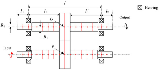 In this paper, the dynamic model consisting of gear–shaft elements is utilized, as depicted in Figure 6, wherein both the helical gear and shaft are simulated with the Timoshenko beam element. The helical gear is composed of two beam elements with the radius of a reference circle, and the two intermediate nodes of the gears are connected with a spring–damping system, which represents the meshing of the gear pair.