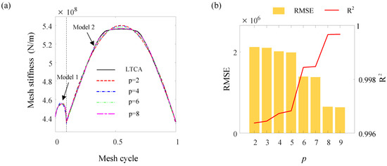 The SPCE model for mesh stiffness requires four inputs: mesh cycle, mesh force, angular misalignment, and center distance. Among them, the relationship between the mesh cycle and mesh stiffness is the most complex. In order to determine the maximal polynomial order for the mesh cycle, PCE models with varying maximal polynomial orders were generated and compared, in which the mesh cycle was the only input parameter. RMSE and R2 were then employed as accuracy indices to evaluate the accuracy of the generated models (see Figure 9). It should be noted that the PCE model contained two sub-models because of the change in the number of mesh teeth, and the polynomial order of the two sub-models is the same. The results indicate that the accuracy of the PCE model improved with an increase in the polynomial order. In order to ensure both computational efficiency and accuracy, the maximal polynomial order of the mesh cycle was set to 8. At this order, the value of R2 was 0.9994, and the RMSE was 5.75 × 105, indicating the high level of accuracy of the PCE model.