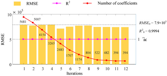 The PCE model for mesh stiffness was generated using the training set, and the influence of each factor is presented in Figure 10a–c. To assess the accuracy of the model, test points were randomly selected on the response surface, and the accuracy indexes were calculated as shown in Figure 10d. It can be seen that mesh stiffness increased with increasing load but decreased with an increasing misalignment angle and center distance. Furthermore, the accuracy indexes indicate that the model accurately reflects the factors that influence mesh stiffness. The proposed sparsification method was then applied to the PCE model, and 21 groups of mesh stiffness with random input parameters were calculated and employed as the testing set. As shown in Figure 11, the coefficients of the PCE model decreased gradually with the increase in iterations. During the sparsification process, R2 remained almost unchanged, and the RMSE decreased slightly, which suggests that the sparse model maintains the accuracy of the original model.