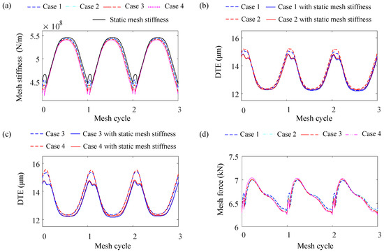 Dynamic meshing characteristics: (a) dynamic mesh stiffness; (b) DTE of Case 1 and Case 2; (c) DTE of Case 3 and Case 4; and (d) dynamic meshing force.