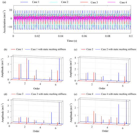 The acceleration signal at the bearing of the driving shaft in Figure 8 was extracted and presented in Figure 13. In Figure 13a, the highest vibration acceleration response is obtained in Case 1, whereas the lowest response is exhibited in Case 4. This discrepancy can be attributed to the fact that the shaft in Case 1 was the shortest and the bearing was positioned closest to the gear. Furthermore, the significant impact of variations in mesh stiffness on the dynamic response calculations can be observed in Figure 13b–e. In the spectrum, the components corresponding to the first four mesh frequencies display relatively minor changes, while the fifth and sixth mesh frequencies experience more pronounced alterations. The reason for this discrepancy is that changes in mesh stiffness affect both the dynamic characteristics and internal excitation of the system.