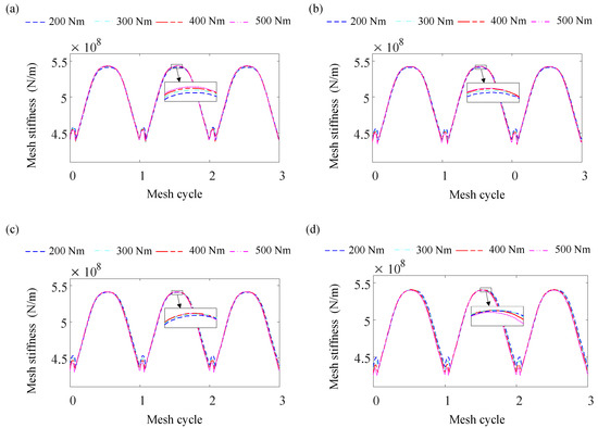 In order to explore the influence of the loads on the dynamic mesh stiffness, different loads of 200 Nm, 300 Nm, 400 Nm, and 500 Nm were substituted into Case 1–4, and the dynamic mesh stiffness values were obtained and are shown in Figure 14. It can be seen that Case 4 was the most sensitive to the change in loads. In Cases 1–3, the mesh stiffness was relatively smaller in the area with more mesh teeth when subjected to a greater load. Conversely, in the area with fewer mesh teeth, the mesh stiffness was relatively larger under a higher load. In Case 4, the mesh stiffness decreased throughout the whole mesh cycle with the increase in load. Figure 10 illustrates that the increase in the mesh force resulted in an increase in mesh stiffness, whereas the increases in the misalignment angle and center distance led to a decrease in stiffness. The phenomenon depicted in Figure 14 is clearly related to the combined effect of several factors. In Case 4, greater flexibility resulted in higher system deformation when subjected to the increase in load. This deformation subsequently increased the misalignment angle and center distance, leading to a lower mesh stiffness with greater load. Conversely, in Cases 1–3 with relatively small flexibility, the increase in the load in the area with less mesh teeth led to an increase in the mesh force. The influence of the mesh force was greater than that of the misalignment angle and center distance, resulting in an increase in mesh stiffness.