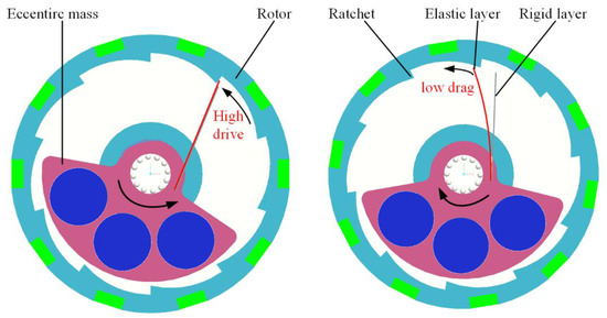 The structure of the proposed EEH is shown in Figure 1. The eccentric mass can be excited by external mechanical vibrations and transfer the kinetic energy to the rotor via a two-layered cantilevered plectrum that pushes the ratchet set at the inner surface of the rotor. The two-layered cantilevered plectrum is inserted into the central arc of the eccentric mass, which includes a left elastic layer and a right rigid layer. The effective length of the elastic layer (from its clamped end to the tip) is long enough to touch the tooth of the ratchet, whereas the rigid layer is a little shorter, avoiding connection with the tooth. As shown in Figure 2, when the eccentric mass is excited and spins clockwise, the cantilevered plectrum exhibits low stiffness and low frictional resistance against the rotor. On the contrary, when the eccentric mass is excited and spins anticlockwise, the cantilevered plectrum exhibits sufficient stiffness to drive the rotor homodromy. Thus, the rotor can be driven and accelerated to a high unidirectional speed by the eccentric mass, even though the excitation is ultralow-frequency, irregular or intermittent.