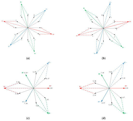 Coil and phase vectors with different configurations: (a) 12C/10P; (b) 12C/14P; (c) 18C/16P; (d) 18C/20P.