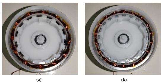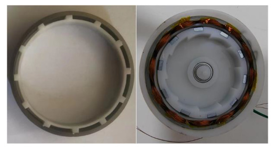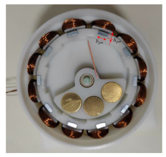 In general, the 12C-10P and 18C-16P configurations exhibit a high voltage hamonic component. By contrast, the harmonic THD of 12C-14P and 18C-20P are sufficiently low, all less than 1%. With the increase of bpm, the voltage amplitude values of every configuration would increase uniformly, but the magnetic efficiency of every configuration would decrease. This is because although the 12C-14P and 18C-20P configurations exhibit a larger value (over 1.0 V), 18C-20P has a low ratio of voltage amplitude to PM mass, while the ratio of 12C-14P is the highest. This is due to the magnetic resistance of the non-magnetizing resin material being large, and the flux leakage increasing when the PM intensity increases. To reduce the cost and weight, 12C-14P with bpm = 6 mm is determined as the optimal configuration, as shown in Figure 13. Meanwhile, 18C-20P with bpm = 4 mm was also manufactured to verify the effectiveness of the FEM results.
