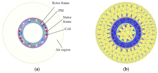 The electromagnetic performance of the proposed EEH can be simulated by FEM through the opensource software FEMM, MaxFem, and the commercial software Anasys, Comsol, etc. The general processes are approximately the same for each of these software packages. The initial prototype, including stator and rotor topology, can be established as the 2D electromagnetic geometric model for its cross-section, as shown in Figure 5a. The material property of each part is defined, and excitation and boundary conditions are set. Then, the finite element mesh is generated, as shown in Figure 5b. According to the following partial differential equation of magnetic potential vector Az, numerical computation can be conducted by the FEM solver.