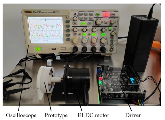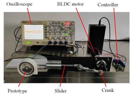 For instance, the rotor can be simulated to spin for an electrical period with different speeds, which enables the induced three-phase voltage waveforms to be obtained. As shown in Figure 6a, the three-phase voltage waveforms are obtained when the rotor speed is set to 600 rpm. To verify the accuracy of the FEM results, the initial prototype was connected to a brushless DC motor, which can be regulated to drive the prototype at different speeds, as shown in Figure 7. The experimental results of the induced voltage waveforms at 600 rpm were obtained, as shown in Figure 6b. By comparison, in one period of Phase A (Figure 6c), the experimental results are is in a good agreement with the predicted FEM results in regard to both the waveform and peak values.