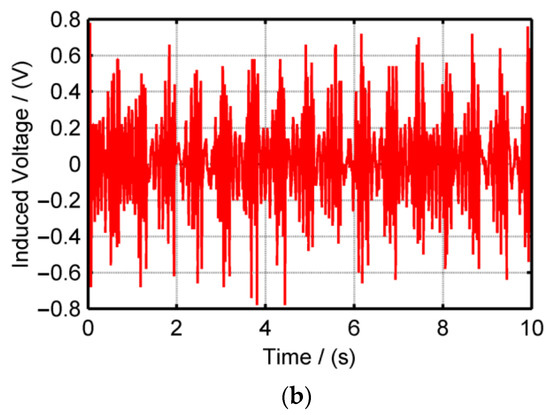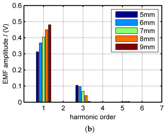 With the increase in bpm, the voltage amplitude increases, and exhibits a more fundamental sine. Harmonic analysis is shown in Figure 8b. The main harmonic component is the three-time harmonic, when bpm = 5 mm, and the total harmonic distortion (THD) is about 34%; when bpm = 9 mm, the THD reduces to only 2.0%.