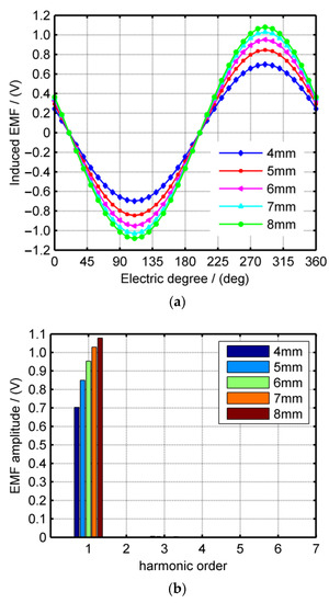 The dimensions of the PM affect the intensity of the magnetic field directly. The axial length is equal to a rotor length of 10 mm. To reduce the magnetic resistance, the thickness of the PM hpm should be set to a small value; this value was determined to be 2 mm, as shown in Figure 4. Thus, the width of the PM bpm is regulated at different values of 5 mm (initial), 6 mm, 7 mm, 8 mm and 9 mm. The corresponding results of the induced voltage waveforms are shown in Figure 8a. To present a distinct display, only the phase-A waveforms are compared.
