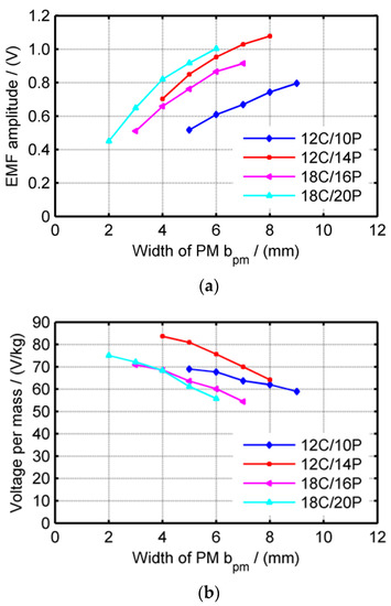 The 18C-16P and 18C-20P configurations were also analyzedand the voltage amplitude results of different configurations were compared, as shown in Figure 12a. In addition, to indicate the magnetic efficiency of the PM, the ratio of the voltage amplitude versus the PM mass was also compared, as shown in Figure 12b. Moreover, the values of voltage amplitude, harmonic THD and voltage per PM mass with different configuration are listed for comparison in Table 1.