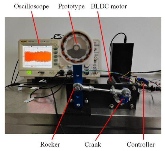 With the optimal electromagnetic performance, the EEH prototypes were excited by different kinds of vibrations to validate their vibration energy-harvesting performance. The experimental setup for swing motion exciting is shown in Figure 15, where the swing motion is provided by a crank-rocker mechanism driven by a BLDC motor. Different conditions of swing excitation were supplied. The swing frequency of the crank-rocker mechanism was regulated by controlling the rotation speed of the motor (0~3000 rpm). Additionally, the swing angle can be changed by varying the length of the crank in a range from 20° to 80°. The length of the rocker, which is the distance from the pivot point to the center of the EEH, can be set to 132 mm, 102 mm or 72 mm. The electric outputs of the EEH prototype were displayed and stored through an oscilloscope.