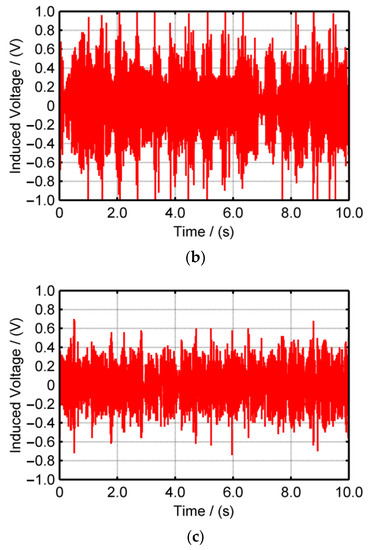 Output voltage of the three prototypes under swings with 2.5 Hz, 60°: (a) 12C-10P with bpm = 5 mm (initial); (b) 12C-14P with bpm = 6 mm (optimal); (c) 18C-20P with bpm = 4 mm.