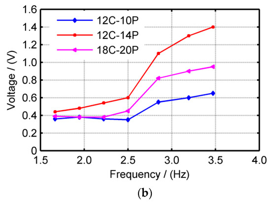 The length of the rocker was set to 132 mm, with a swing angle of 60° and a swing frequency of 2.5 Hz. Excited by the same swing motion, the open-circuit voltage outputs of the three manufactured prototypes are shown in Figure 16. Continuous voltage waveforms were generated. The optimal 12C-14P prototype produced the maximum amplitude voltage. The swing frequency was varied to explore the harvesting response performance, from 1.6 Hz to 3.5 Hz. Then, the swing angle was changed to 40°, and the frequency variation was conducted again.