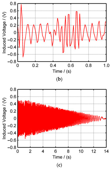 Output voltage of the 12C-14P prototype with two eccentric mass structures in ultra-low swing frequency (1Hz): (a) With initial structure under swing; (b) With whole steel block structure under swing; (c) With whole steel block structure after swing remove.