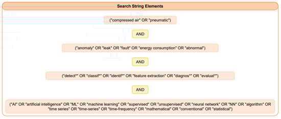 The third and fourth parts of the search string aim for various anomaly detection techniques. The former specifies the type of anomaly detection effort, such as classification, identification and diagnosis. The latter comprises the possible approaches for anomaly detection being implemented. Therefore, it includes possible AI and ML keywords, such as NNs and different learning types, along with time series terms as well as conventional mathematical techniques. For clarity, Figure 1 shows the four main elements of the generated search term.
