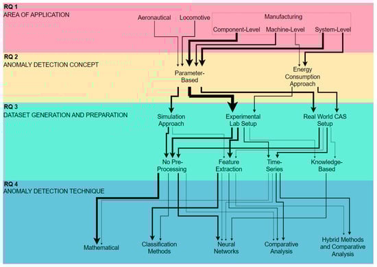 Four RQs were presented within this systematic literature review to characterise the included publications. RQ1 aimed to identify the industry areas in which anomaly detection techniques are being studied. This resulted in three main areas—the aeronautical, locomotive, and manufacturing industries—with a major focus on the latter. RQ2 focused on the anomaly detection data type. The majority of publications involved parametric data collected from sensors that monitor the behaviour of the system or component, such as pressure, acceleration, vibration, and airflow sensors. This was followed by two more comprehensive RQs. The third aimed to identify how datasets were generated, from where, and what type of preprocessing was performed. It was shown that in general, all the generated datasets involved both normal and faulty conditions, so its use within the anomaly detection technique can be trained, tested, and validated. A number of different preprocessing techniques were observed, mainly depending on the type of application and the dataset generated. The final RQ then focused on the type of anomaly detection approaches within CA applications. It was shown that a trend exists from early publications in 2012 and 2013, where the majority applied a mathematical-based approach, to more intelligence-based approaches presented in the last few years, especially during 2019. The intelligent approaches were categorised within three main sections, including classification methods, NNs, and hybrid solutions, which involved both ML methods and time-series analysis. This was then followed by a bibliometric analysis for the PRISMA-included publications, as it was deemed necessary to analyse research characteristics, themes, and correlations in a quantitative and visualised manner. The bibliometrix tool within the R software environment was used and four types of plots were developed, including author productivity over time, a keyword co-occurrence network, a thematic map, and a three-field plot. Such visualisation methods clearly showed that the main focus of this systematic literature review is intelligent methods for anomaly detection of CASs.