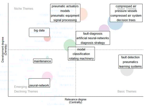 The first quadrant shows all motor themes, which have both high centrality and density. These are the most relevant keywords within the research field of this systematic literature review [75]. This quadrant includes the term ‘artificial neural networks’, which nine publications used for CA-related anomaly detection [39,43,44,45,56,59,63,64,67,71]. Additionally, the terms ‘diagnosis strategy’ and ‘fault diagnosis’, along with ‘compressed air’, ‘compressed air systems’, and ‘decision trees’ are featured within this quadrant and were observed in [34,48,51,52,55,58,66]. The second quadrant shows the niche theme, which represents those terms or keywords that are highly developed and associated with isolated themes, since centrality is low, but density is high [75]. In this case, the terms ‘big data’, ‘rotating machinery’, ‘model’, and ‘classification’ are found within this quadrant. This means that within the included publications, these terms were not featured with others, but as isolated topics, though still being highly developed compared with NNs in general.