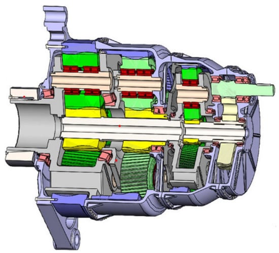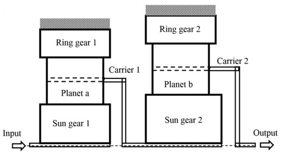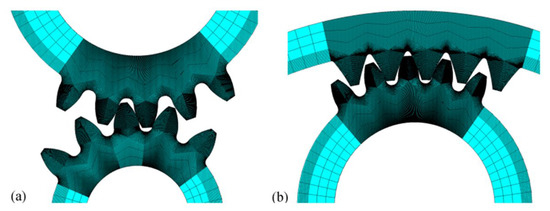 Parker et al. [28] established the finite element model of the planetary gear mechanism for the first time. The research shows that the system’s natural frequencies and mode shapes obtained via the finite element model and the lumped-parameter model are consistent. In 2003, Kahraman et al. [29] established a fully flexible finite element model of a spur planetary gear train and studied the influence of gear compliance on dynamic stress and wheel rim deflection. In 2005, Singh [30] established a three-dimensional finite element model of a helical planetary gear train based on the two-dimensional finite element method. The model was used to study the relationship between the tangential error of gear pinhole and the number of planetary wheels and load distribution coefficient. In 2009, Abousleiman et al. [31] proposed a finite element model that can simulate the dynamic behavior of spur gear and helical gear planetary transmissions. In 2017, based on the ADAMS software, Salagianni et al. [32] considered the influence of gear backlash and friction in the mixed lubrication process and used the combined friction dynamics modeling method to conduct a modal analysis of the planetary gear system. In 2018, Liu et al. [33] established the dynamic finite element model of the planetary gear train. The friction force in the planetary gear set was calculated using the Coulomb friction model. The effects of rotational speed, torque, and fault width on the dynamic characteristics of planetary gear trains were discussed. In 2019, Zhang et al. [34] established a transient dynamic analysis model of a two-stage planetary gear train using the finite element method based on the schematic diagram of the two-stage planetary gear transmission shown in Figure 5. In 2021, Sang et al. [35] established a three-dimensional model of the 3K-II planetary gear train, as shown in Figure 6. The time-varying stiffness of the internal/external mesh pair under different gear tooth root crack faults was calculated by using the finite element method. Figure 7 is the finite element model of the external (a)/internal (b) meshing gear pair. On this basis, the time domain and frequency domain characteristics of the lateral vibration signal and output torsion signal are studied.