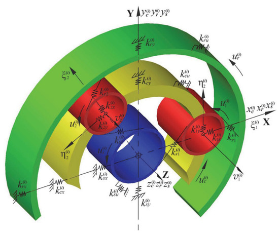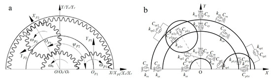 In Figure 11a, OXY is the global coordinate system. OCXCYC and OrXrYr are the inertial coordinate system of the planet carrier and the sun gear. OpiXpiYpi are respectively the follow-up coordinate system of the ith planetary gear (i = 1,2,3). In the Figure 11b, the carrier is coupled with the planet pin-bearing assembly via stiffness kcp and damping Ccp. The carrier support bearing is modeled by stiffness kc and damping Cc. The sun gear connects to planet gears along the line of action through gear mesh stiffness kjp and damping Cjp. The sun and ring gears coupled to the ground or shaft via support stiffness kj and damping Cj, also a torsional stiffness kju and damping Cju, (j = s,r).
