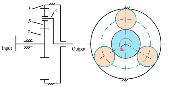 In 2017, Zhang et al. [20] established a three-dimensional dynamic model of a two-stage helical planetary gear by using the lumped-parameter method, as shown in Figure 3. The model was adapted for a different number of planets and different planetary phasing and spacing configurations in the two phases. In Figure 3, the component bearings, gear meshes, and interactions between the two stages are all modeled using linear springs (k). The damping is not shown in the model. In 2019, Liu et al. [21] proposed a two-stage planetary gear system with sliding friction and elastic continuous ring gear. The modal characteristics and resonance problems of the system are studied using the lumped-parameter method. MO et al. [22] established the dynamic model of the herringbone planetary transmission system based on the idea of parameter centralization and the Lagrange method. In 2020, Shen et al. [23] established a purely torsional vibration dynamic model of the 2K-H planetary gear set (Figure 4.). In the figure, s is the sun gear, p is the planetary gear, c is the planet carrier, and r is the ring gear. The research shows that the model can well reflect the influence of tooth surface wear on the dynamic characteristics. Zhang et al. [24] established a planetary gear train translation–torsion dynamic model using the lumped-parameter method. The natural frequency and vibration mode characteristics of the coaxial helicopter main reducer were analyzed. Leng et al. [25] established a translation–torsion coupling model of a two-stage planetary gear transmission system. The effects of the chaotic frequency and tooth backlash on the non-linear characteristics of a two-stage planetary gear train were studied. In 2022, Zhang et al. [26] established a purely torsional non-linear dynamic model of the herringbone planetary gear transmission system using the lumped-parameter method.