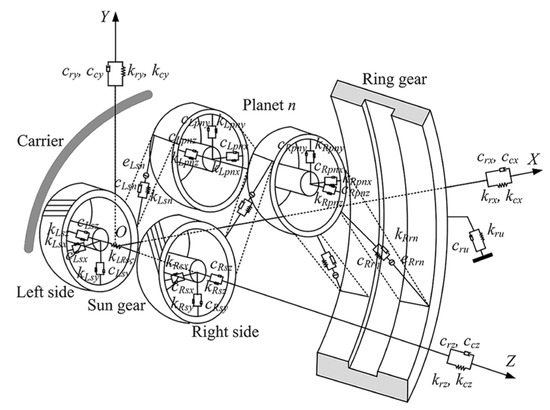 In 2001, Kahraman et al. [37] used the finite element/semi-analytical non-linear contact mechanics method to model the typical planetary gear mechanism of an automotive automatic transmission. In 2006, based on the modal condensation method, Velex [38] established a hybrid three-dimensional finite element/lumped-parameter model and used it to analyze the planetary gear dynamics of the flexible internal ring gear. In 2009, Ma et al. [39] established the rigid–flexible coupling model of the planetary gear and studied the dynamic response characteristics of the planetary gear train under extreme conditions. In 2012, Parker et al. [40] studied the non-linear dynamics of planetary gears with elastic ring gears and gave frequency response functions for primary, subharmonic, and superharmonic resonances. In 2021, Wang et al. [41] analyzed the influence of faulty gears on the dynamic characteristics of planetary gear systems and conducted a joint simulation analysis using rigid–flexible coupling dynamic models. In 2020, Xu et al. [42] considered the coordination conditions of torsional compliance and axial sliding of the left and right teeth of the sun gear and established a dynamic model of the herringbone planetary gear system based on the parameter concentration method, as shown in Figure 8. Studies have shown that with increasing torsional compliance (decreasing torsional stiffness), the mesh stiffness and maximum tooth surface load of the sun and planet gears both increase on the left (input side) and decrease on the right. In the figure, O-XYZ is the static coordinate system. The X-axis goes through the first planet’s rotation center and uses the rotation center of the carrier as the origin, which rotates at a constant speed around the Z-axis with the angular velocity ωc of the carrier.