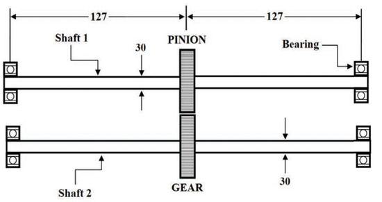 Scholars have found that the gear–rotor system will be subject to additional excitation caused by the basic motion of the system in practical work. Taking the aircraft rotor system as an example, the basic motion includes level flight, dive, hover, climb, various difficult flights, etc. Wen et al. [64] think that the influence of aircraft maneuvering flight on the dynamic characteristics of rotor systems can be regarded as a kind of basic excitation. In 2006, Duchemin et al. [65] derived the motion equation of the rotor system under the basic motion condition by using the Lagrange energy method. In 2010, El-Saeidy et al. [66] derived the dynamic equation of the rigid rotor using the six degrees of freedom under the coupling action of the foundation motion excitation and the mass unbalance mechanism. In 2014, Hou et al. [67] studied the dynamic response of the friction-impact rotor system during hovering and analyzed the influence of non-inertial environments on the non-linear dynamic behavior of the rotor system. In 2016, Saxena et al. [68] used the ANSYS finite element analysis software to conduct a modal analysis of the ball-bearing gear–rotor system. The influence of the bearing stiffness variation on the gear–rotor system’s natural frequency was studied. Figure 9 is a schematic diagram of the gear– rotor system; the unit is mm. In 2018, Han et al. [69] used the finite element method to establish a dynamic model of the rotor bearing system and studied the irregular transient vibration of the system during maneuvering flight. In 2019, Soni et al. [70] studied the vibration response of the maglev rotor system when the airframe pitched, rolled, and yawed. In 2021, Han et al. [71] established a multi-stage gear–rotor transmission system model using the finite element method. The steady-state response of the system caused by the unbalanced quantities and static transmission errors was studied.