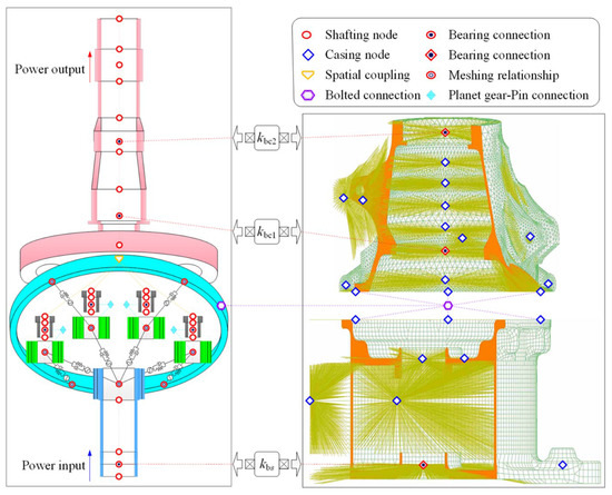 Leque et al. [83] established a single-stage planetary gear train 6N-DOF (N is the number of components) dynamic model. The load-sharing characteristics of the system were studied. Iglesias et al. [84] studied the influence of eccentric errors and planetary pin axis errors on the load sharing of the planetary gear train under quasi-static conditions. In 2018, Zhang et al. [85] used the translation–torsion lumped-parameter model to study the influence of multiple meshing phases on the load sharing of herringbone planetary gears. Hu [86] proposed a load distribution model of the helical planetary gear train, which can predict the influence of support stiffness, pin position error, runout error, tooth thickness error, meshing phase, and tooth surface modification on the tooth surface load. In 2019, Hu et al. [87] improved the definition of dynamic load and load sharing coefficients of the planetary gear train. In 2020, Chung et al. [88] found, through simulation, that floating components can effectively improve the problem of uneven load distribution caused by non-torque loads and pinhole position errors. In 2022, Peng et al. [4] established the dynamic model of the planetary gear transmission system based on the idea of node finite element and by considering the time-varying mesh stiffness, tooth backlash, tooth profile error, internal inertia system, and external inertia system. The influence of maneuvering space motion on the load distribution of planetary gear transmission was studied. The system-level coupling dynamic model is shown in Figure 12. From the above research, it can be found that the main purpose of the current research on uniform load and dynamic load characteristics was to explore the influence characteristics of various objective factors inside and outside of the planetary gear system, such as dynamic excitation, error, inertia load, and so on. However, most studies ignore factors such as the non-inertial load, system flexibility, etc. In addition, it can be found that the finite element model is better than the lumped-parameter model. Combined with experimental research, the load characteristics of the system can be better explored.